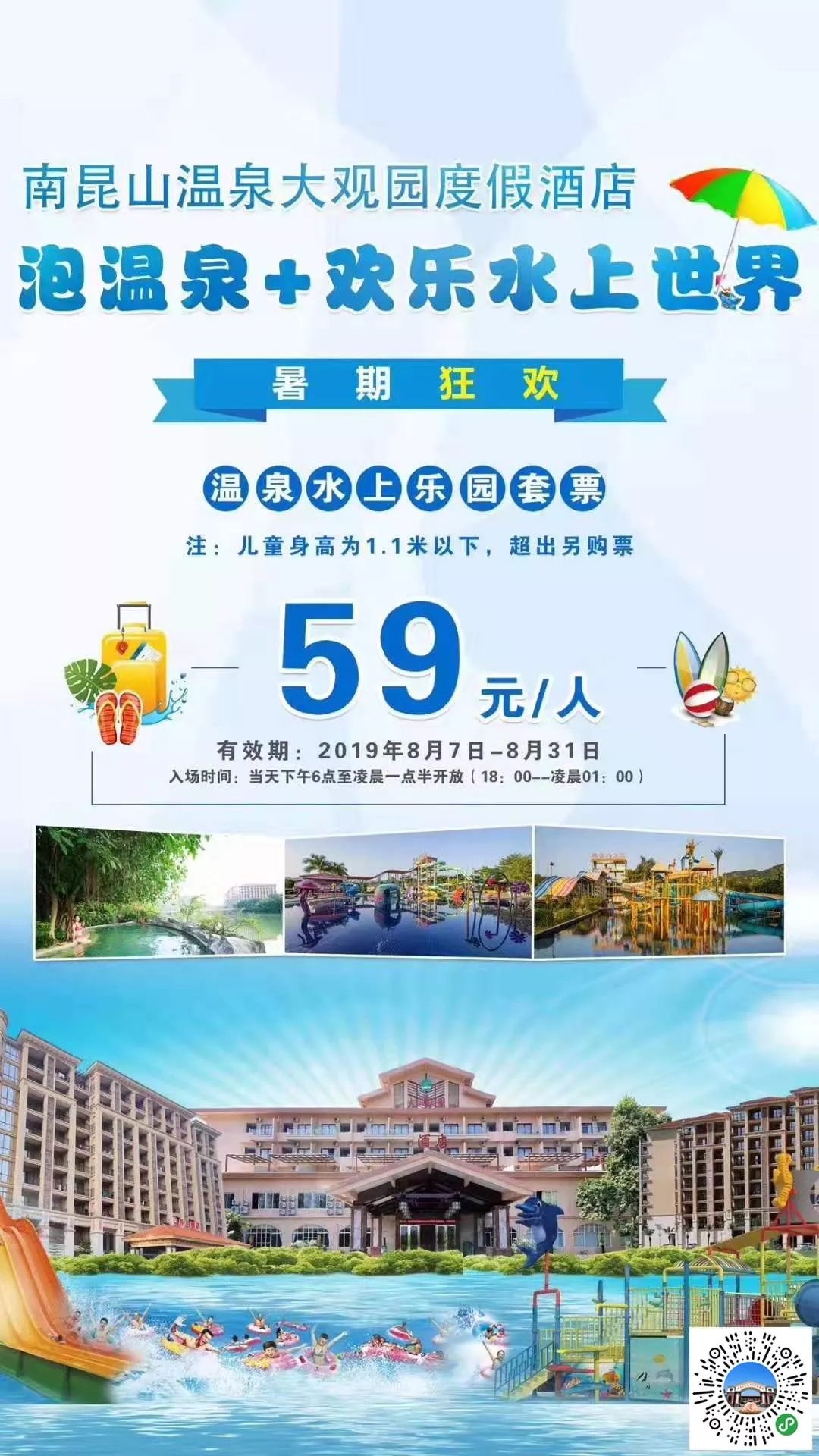 夜场专用 ① 夜泡门票 成人:温泉59元/位 儿童:温泉18元/位 注:1位成人仅可携带一名儿童 超出按正常价格购买 使用时间:18:00-01:00 活动日期:2019年8月8日-9月30日 费用包含 79个功能各异温泉泡池 欢乐水世界 游泳池 真温泉 让肌肤喝饱水 让你的夜晚不寂寞 夏天,总是给人留下美好的回忆 就像繁花一样在人们心中永远不停地盛开 约二三好友一起,找那样的一个地方 将快节奏生活的疲惫放松到极致 大观园外景图 夜泡纯天然温泉·听泉涌虫鸣 夜泡温泉是最舒心的享受 没有白天的吵闹和拥挤 唯有星空为幕,晚风轻吟 温热的温泉浸润着身心 满身疲惫和倦意便陡然而落 消失在宁静的夏夜 上期推出“七夕跳跳跳,豪华大奖免费送”活动,经过一个星期激烈的竞争后,获奖名额终于出来了,下面我们恭喜以下获奖嘉宾; 一等奖:高级双人房 二等奖:昆山峡半程漂流门票 三等奖:大观园温泉欢乐水世界套票 奖品使用有效期: 2019年8月8日-2019年8月31日 预约电话:0752-7618188 注:使用奖品需提前1天预约; 客房仅限平日使用,周五、周六不可使用;