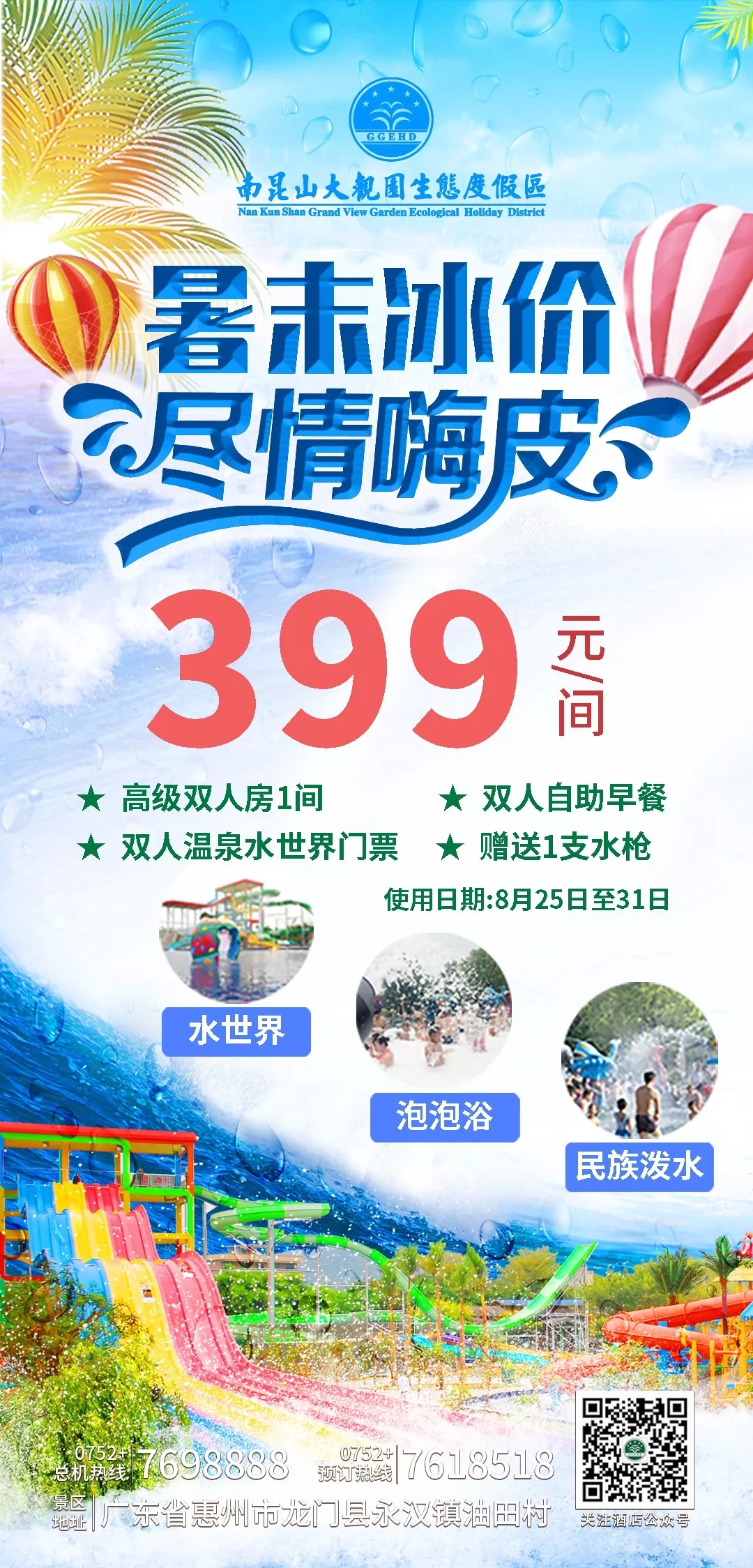 ①两天一夜游套餐 套餐包含:高级双人房+两人温泉欢乐水世界+两人自助早餐 活动时间:2019年8月25日--2019年8月31日