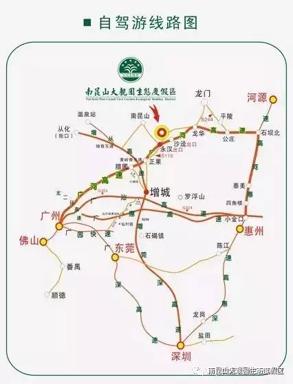增莞深高速→增城市区→(增城体育馆)往正果方向→从莞深高速→广河高速→永汉镇(往龙门方向8公里)→温泉大观园