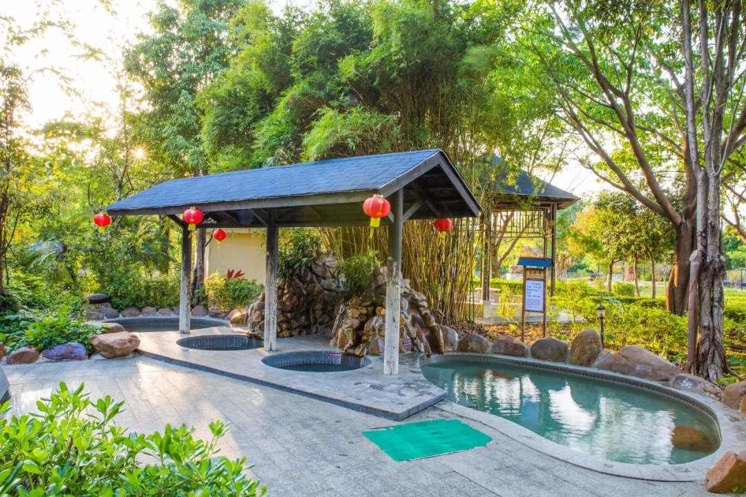 南昆山麓,玉带河畔,温泉大观园得天独厚,山林绵延环抱,森林率达74.5%,空气负氧离子含量均在11万颗每立方米以上,远远超过1000个/立方厘米的保健浓度,达到最高级别的“特别清新”空气标准。