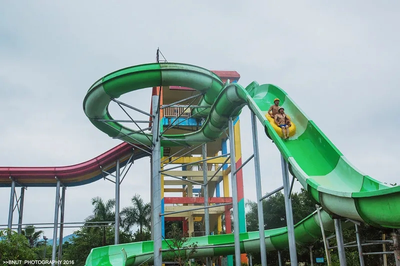 在温泉区域设有温泉欢乐水世界,引进了“冲关回旋”、“六彩滑道”、“动感水屋”、“蘑菇喷淋”、“T型喷水”等多种大型水上游乐项目,高速俯冲,弯道探险,精彩绝伦。其中冲天回旋有水上过山车之称,非常适合喜欢挑战和刺激的年轻人;总长度180多米的六彩滑道,通过助推水流实现分级高速俯冲,让你充分感受到激情水中冲刺,感受超越普通滑道的刺激;总面积超过4000平方米的动感水屋、蘑菇喷淋、T型喷水等专门为儿童设计的游乐设施,设置了多种新奇滑道和动感戏水池等。